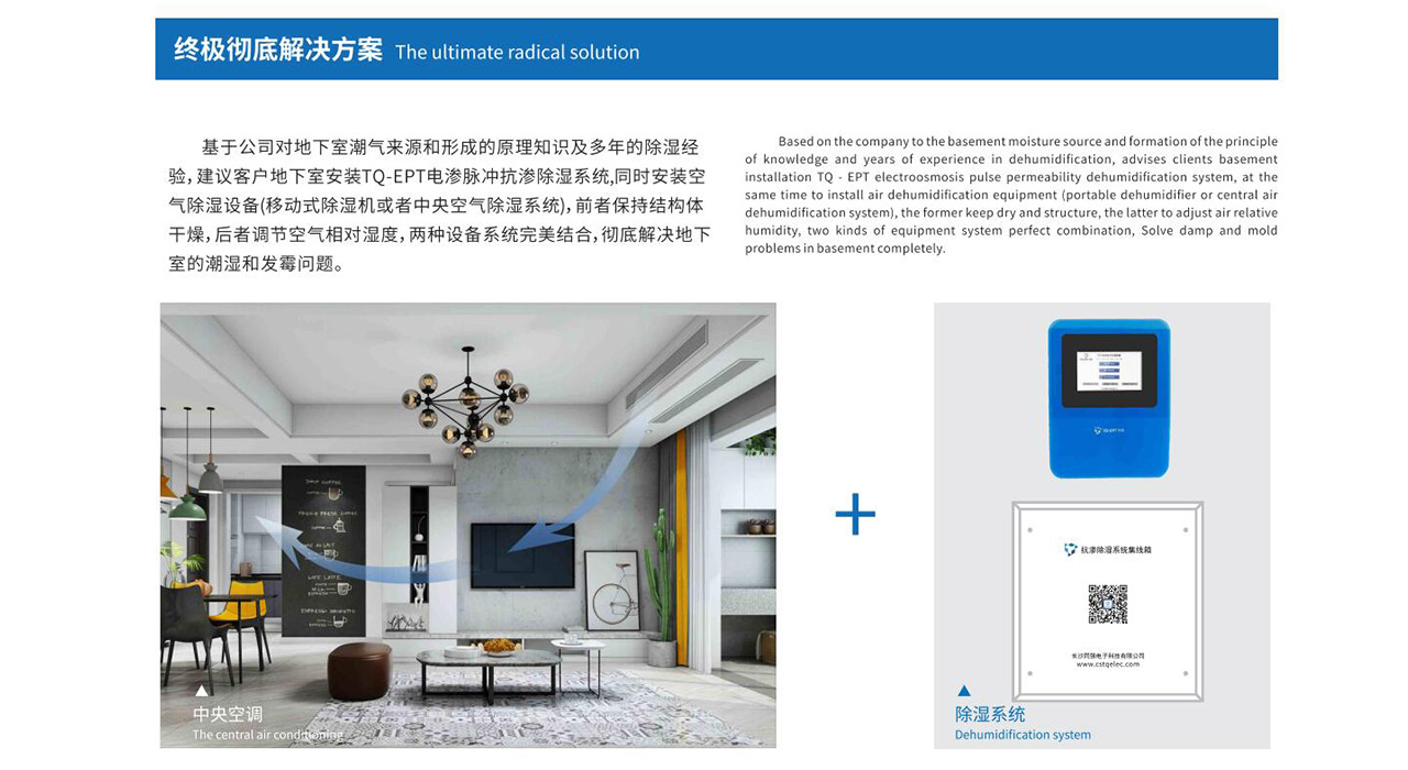 基于公司對地下室潮氣來源和形成的原理知識及多年的除濕經(jīng)驗,建議客戶地下室安裝TQ-EPT電滲脈沖抗?jié)B除濕系統(tǒng),同時安裝空氣除濕設備(移動式除濕機或者中央空氣除濕系統(tǒng)),前者保持結構體干燥,后者調節(jié)空氣相對濕度,兩種設備系統(tǒng)完美結合,徹底解決地下室的潮濕和發(fā)霉問題。